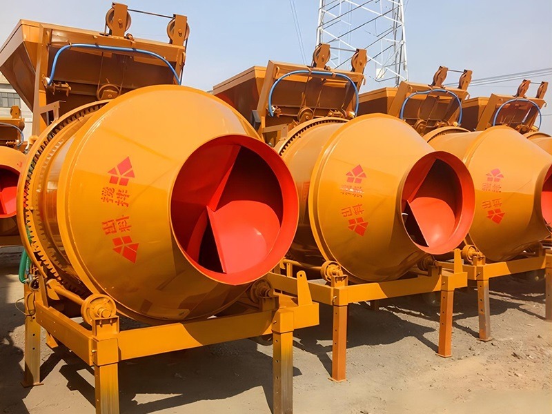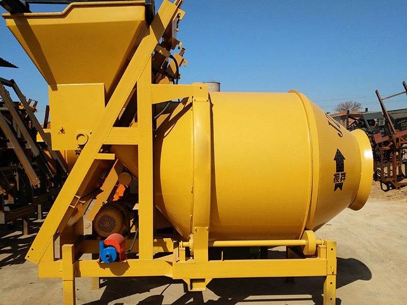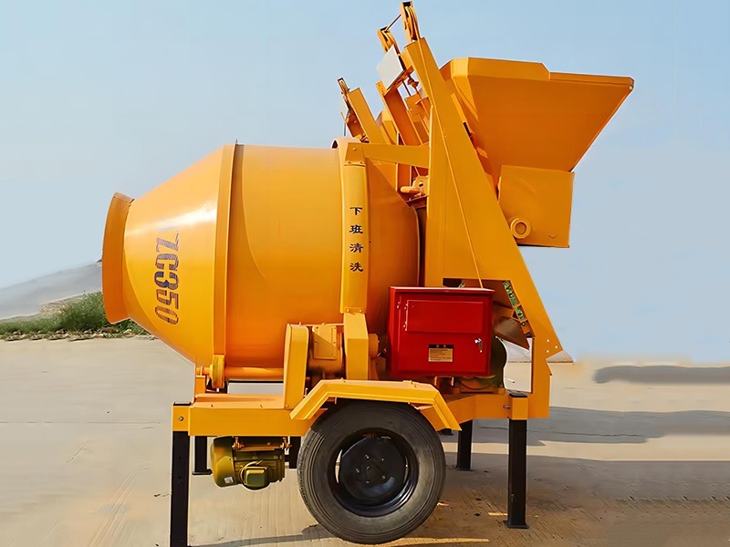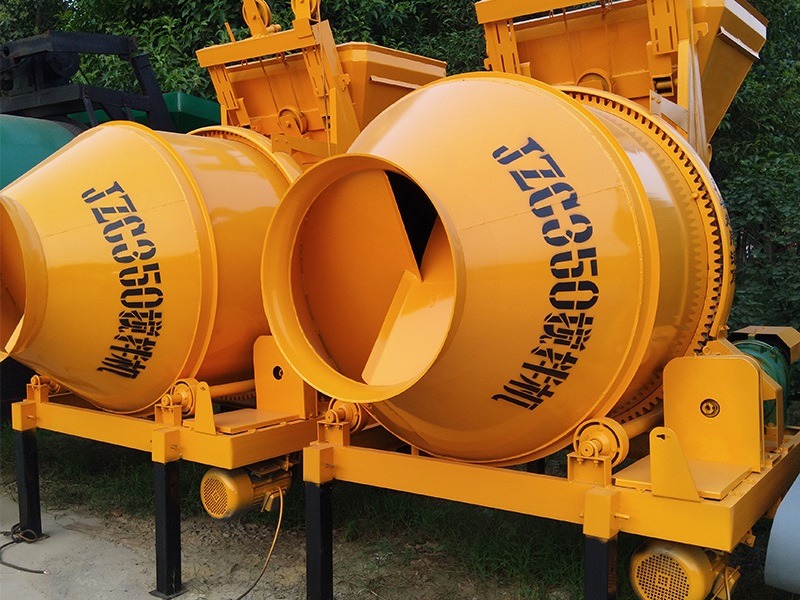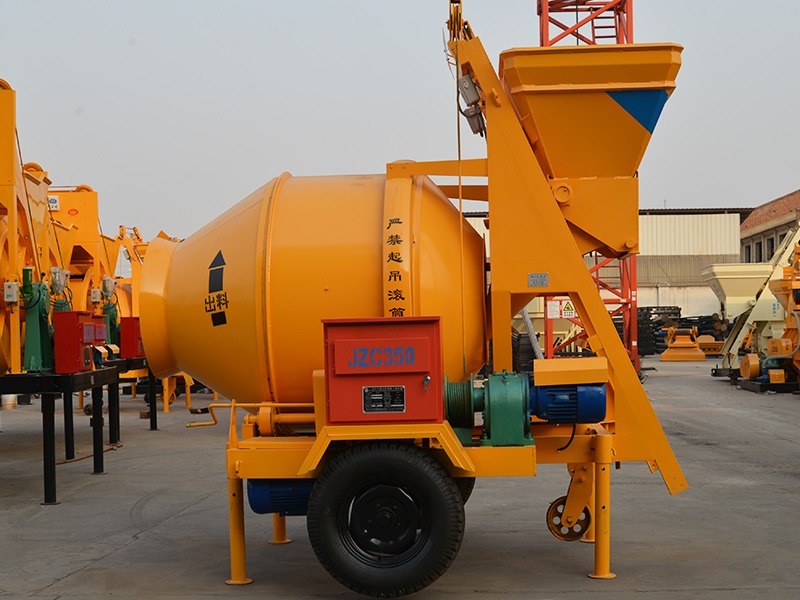 JZC350 electric concrete mixer is a self-falling concrete mixer with double-cone mixing drum for forward mixing and reverse discharging. Each drum can mix 350L of concrete (referring to the volume of compacted concrete), and can produce 10-14 cubic meters per hour.