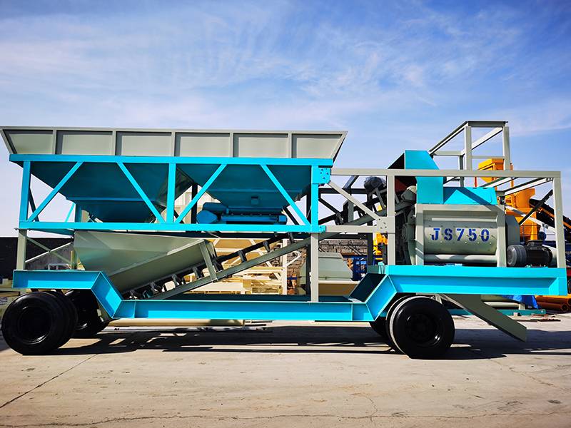 YHZS35 forced mixer belt conveyor mobile concrete batching plant adopts a JS750 double horizontal shaft concrete mixer, batching machine adopts a PLD1200 batching machine, the theoretical output is 35 cubic meters per hour.